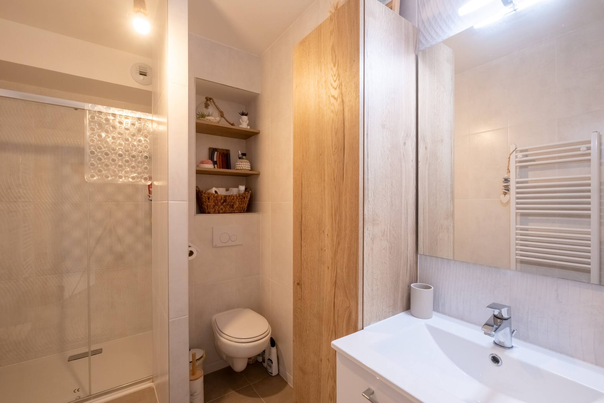 Un couloir mène à une belle salle d’eau avec douche à l’italienne, vasque, meuble de rangement, sèche-serviettes et WC.