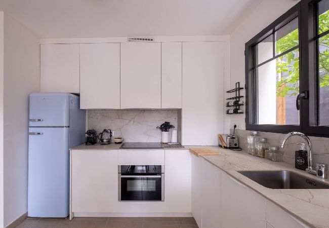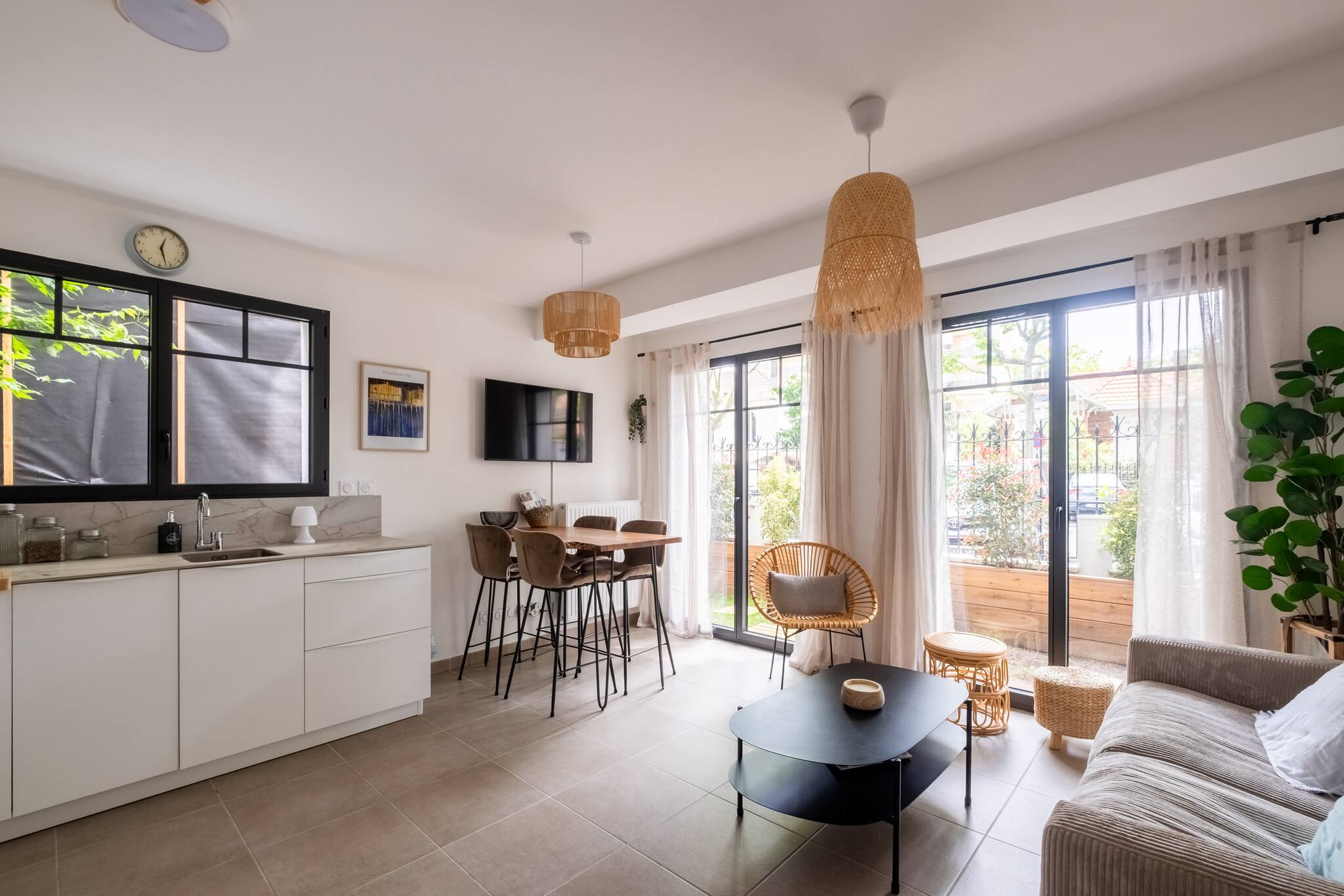 L’appartement d’une surface de 42 m² s’ouvre sur une pièce de vie conviviale, comprenant un salon cosy, une table haute avec 4 assises et une cuisine ouverte entièrement équipée (plaques de cuisson, hotte, lave-vaisselle, four, réfrigérateur avec compartiment congélation, lave-linge, cafetière Nespresso…). L’ensemble donne accès à une vaste terrasse en L de 40 m², orientée nord-ouest, qui fait tout le tour de l’appartement.