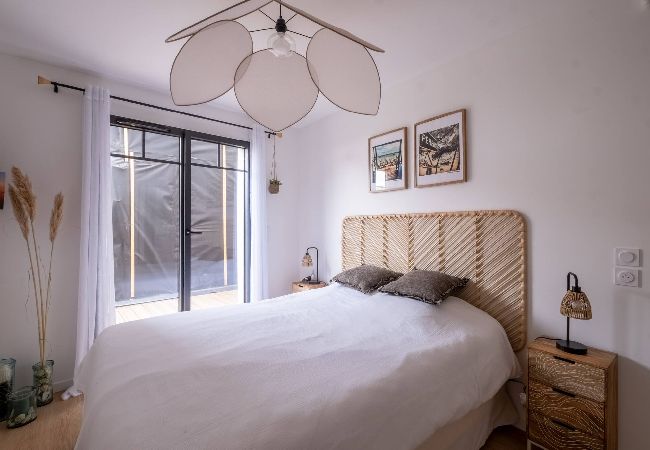 L’espace nuit se compose d’une grande chambre lumineuse équipée d’un lit double en 160 cm et d’un dressing. Une baie vitrée offre un accès direct à la terrasse, à l’abri des regards, pour un réveil tout en douceur.