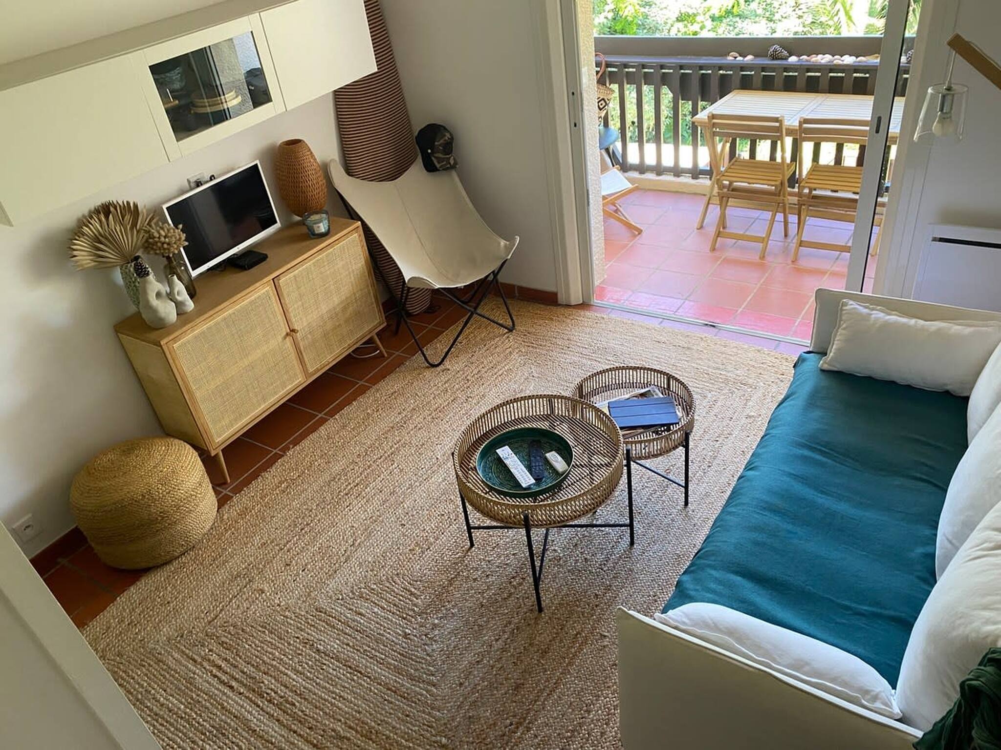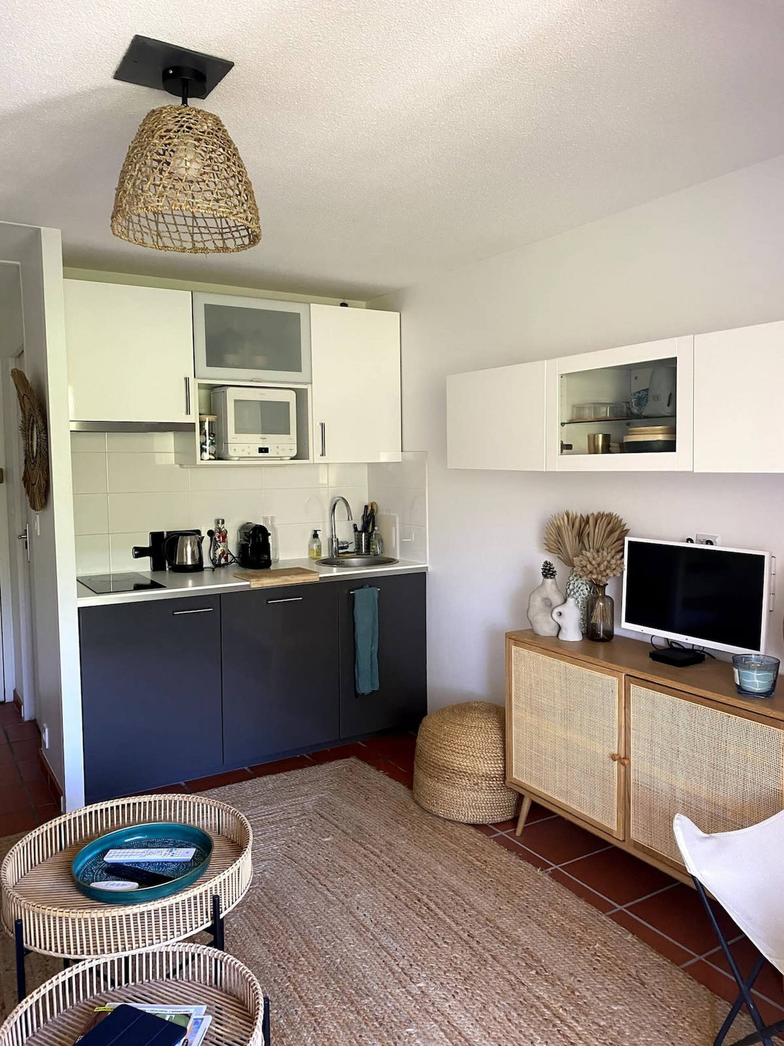 Agencement et confort : Dès l’entrée, vous serez accueilli dans un salon baigné de lumière naturelle, avec un canapé confortable et une télévision pour vos moments de détente. La kitchenette, entièrement équipée, est parfaite pour préparer vos repas, que vous pourrez savourer sur le balcon avec une vue apaisante sur les pins environnants. Ce niveau comprend également des WC séparés avec un espace buanderie pratique.